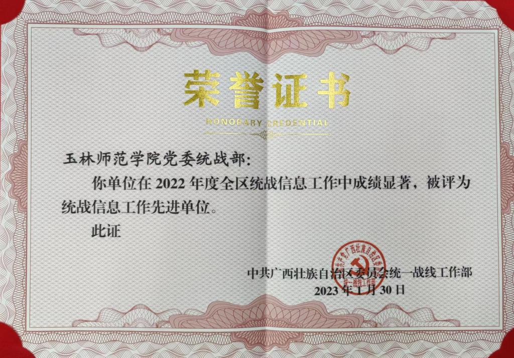 近日,全区统战部长会议在南宁召开。大会深入贯彻落实党的二十大精神和全国统战部长会议精神,总结2022年工作,部署2023年任务,并为获得全国、全区统战信息工作和统战理论政策研究、统战工作实践创新成果奖项的先进单位(个人)颁发荣誉证书。必赢国际bwin获评为2022年度全区统战信息工作先进单位,这也是必赢国际bwin连续2年获得此项荣誉。