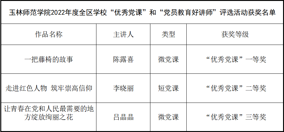 近日,2022年度全区学校“优秀党课”和“党员教育好讲师”评选结果公布,共评选表彰全区学校“优秀党课”一等奖20个、二等奖30个、三等奖40个、“党员教育好讲师”13名。必赢国际bwin历史与文化旅游学院陈露喜老师主讲的《一把藤椅的故事》荣获“优秀党课”一等奖,商学院李晓丽老师主讲的《走进红色人物 筑牢崇高信仰》荣获“优秀党课”二等奖,外国语学院吕晶晶老师主讲的《让青春在党和人民最需要的地方绽放绚丽之花》荣获“优秀党课”三等奖。